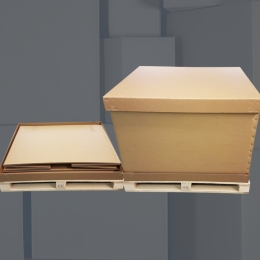 Jedná se o kartonový box s dnem, víkem a vložkou (ring, tubus). Dno je přišité k paletě.